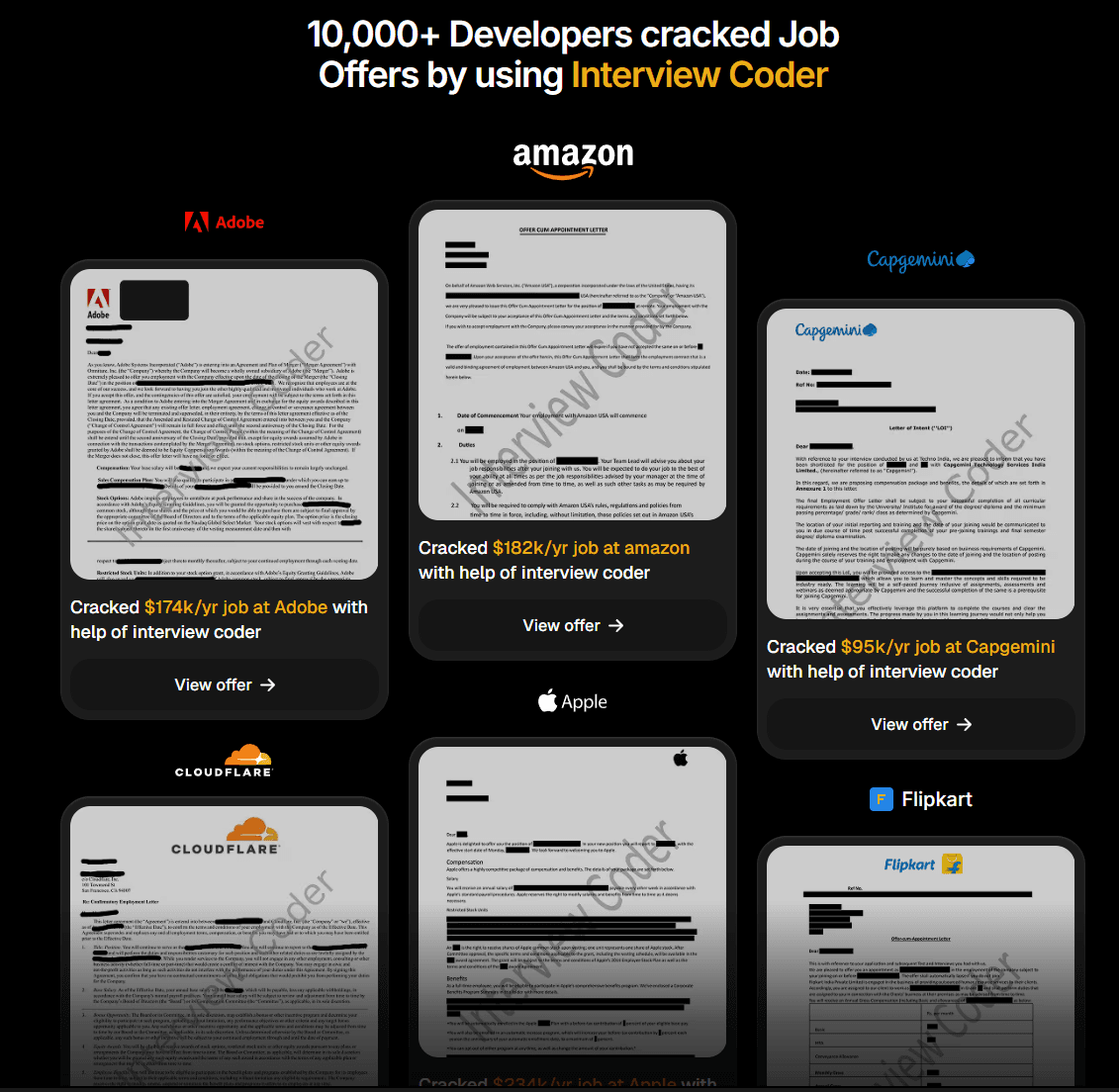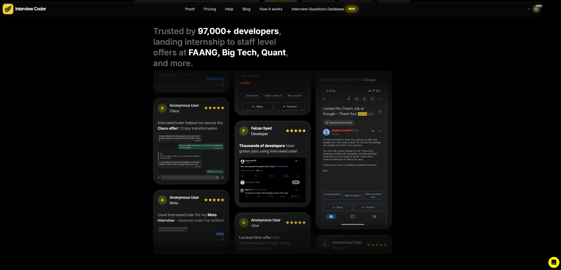 Verified results: InterviewCoder users share FAANG offer letters publicly on Reddit. Final Round AI testimonials are on their own site.