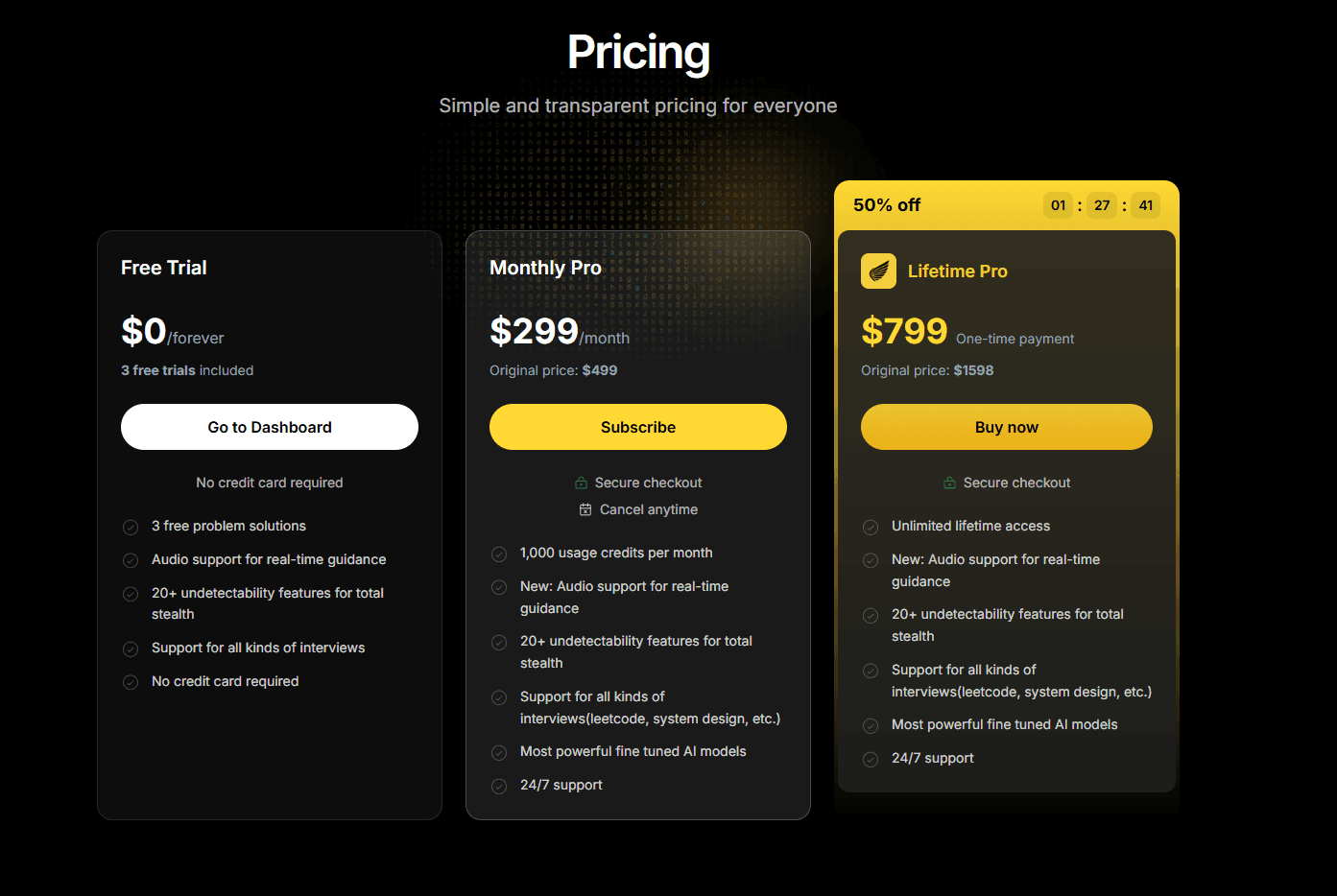 Final Round AI starts at $49/month. InterviewCoder starts at $29/month. You're paying more for a product that has 10x fewer coding problems and no real interview data. The extra cost goes toward features (resume builder, salary tools) that may not be your primary need.